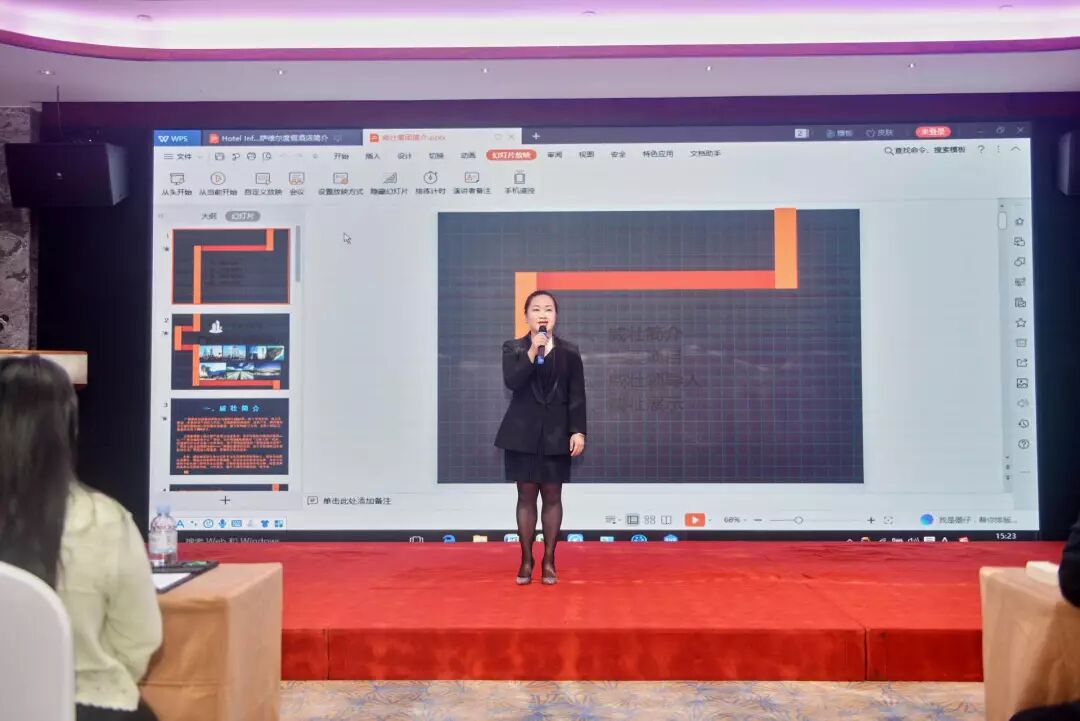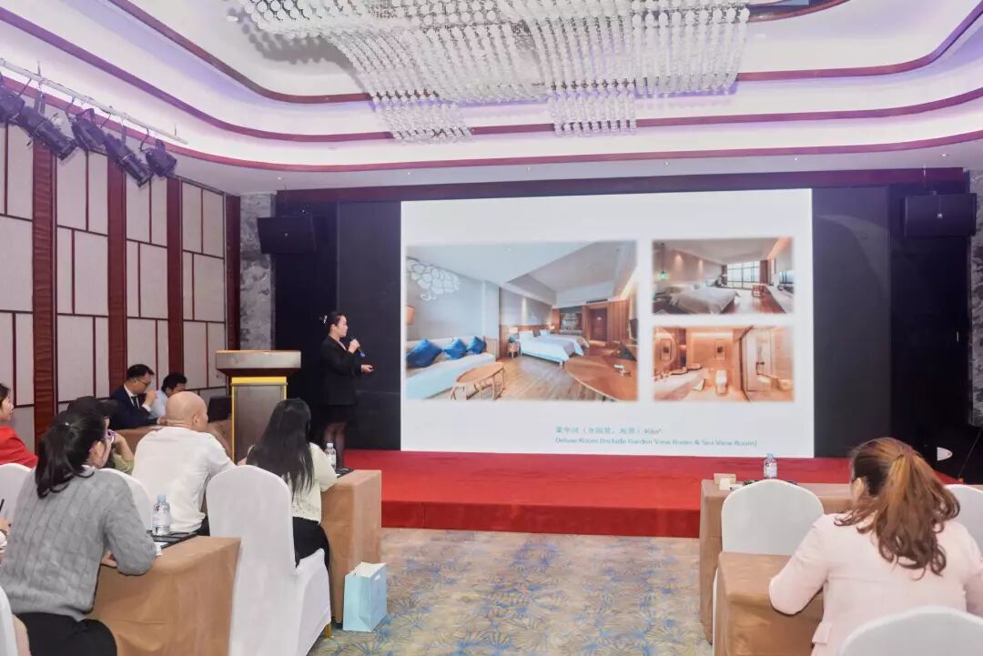 防城港三块石萨维尔度假酒店驻店经理兼营销总监覃丽莉女士,热情洋溢的向到场的各位领导和嘉宾介绍酒店海景客房、中西餐饮、会议场地、康乐婚拍及2019年即将推出的休闲项目。