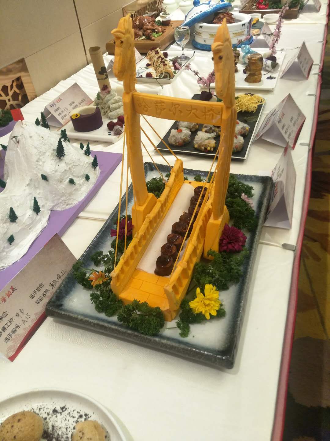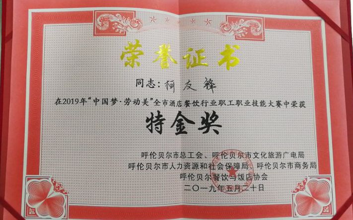 本店厨师长柯友峰与厨房师傅利用业余时间,结合十四冬滑雪赛场(凤凰山、金龙山)及其元素研发寓意“草原雄起”和“九转大肠”菜品,并携带其作品在5月20日下午由呼伦贝尔市文化旅游局、呼伦贝尔市人力资源和社会保障局、呼伦贝尔市商务局、呼伦贝尔餐饮与饭店协会联合举办的“中国梦·劳动美”餐饮职业技能大赛上一举夺得“特金奖”,同时感谢工程部师傅张立顺亲自制作“悬梯”器皿为作品加分!