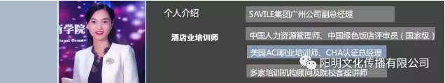 3、中国绿色饭店国家级评审员,中国人力资源管理师。于2017年、2019年分别获得美国ACI职业培训师、美国饭店协会CHA总经理认证。曾接受过中国饭店协会、美国饭店协会、国际酒店管理集团系统的酒店高层管理研修、酒店总裁研修、总经理认证、公共关系等专业化训练与研习,并取得了可观性的证书成果。曾多次受邀中国饭店、英国在华STA培训协会、人力资源管理等行业协会、杂志的特约出席。