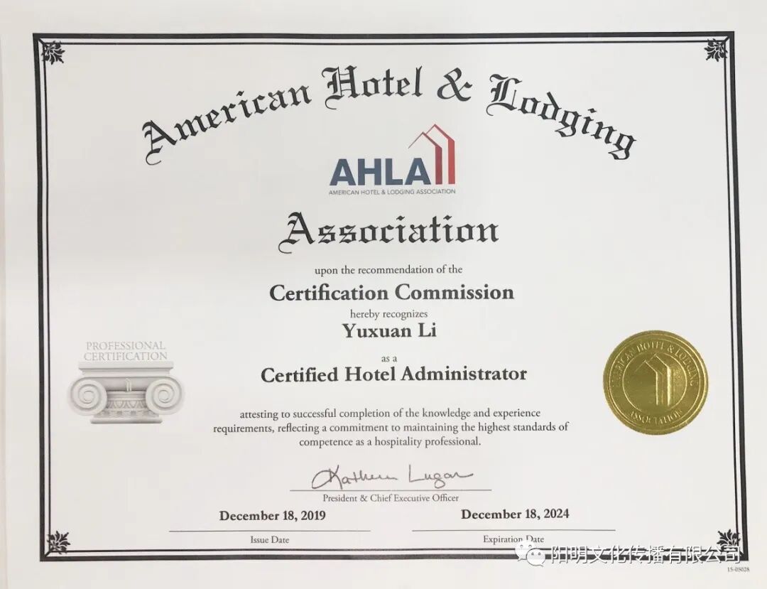 2019年12月5日至8日,萨维尔酒店集团副总经理李雨轩参加了由美国饭店协会教育学院主办,锦江国际理诺士酒店管理专修学院承办的“美国饭店协会教育学院注册饭店高级职业经理人(总经理)CHA”国际职业认证培训班,由现任美国饭店协会教育学院中国区富有酒店管理实战经验的培训导师 - 高岩博士,进行了为期四天的专题培训。经过热情高昂的学习及严格的认证考试过后,萨维尔酒店集团副总经理李雨轩于2019年12月18日通过严格的认证考试,并荣获由美国饭店业协会教育学院颁发的CHA证书。