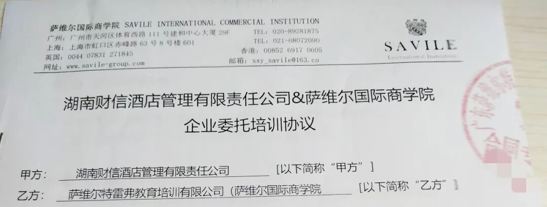 2020年6月15日,萨维尔国际商学院与湖南财信酒店管理有限责任公司达成合作共识,签署内训合作合同,萨维尔国际商学院成为湖南财信酒店管理有限责任公司优秀的合作伙伴。