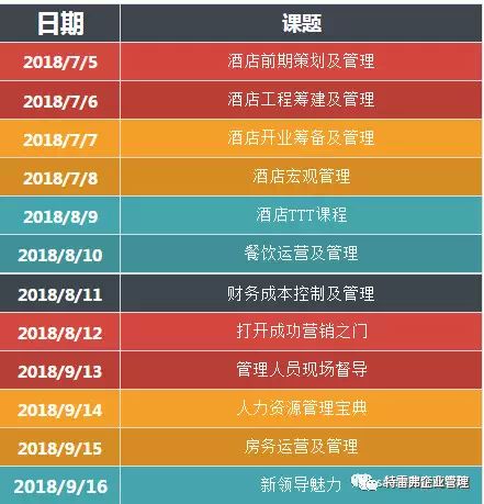 1、期间组织1次实地考察交流(不含在课时内); 2、考核通过颁发理诺士/萨维尔国际商学院结业证书; 3、享受英国萨维尔酒店集团信息化及联盟平台资源; 4、提供英国萨维尔酒店集团人才库平台资源机会; 5、老学员同一课程复训,享受1折优惠;推荐新学员入学,则免费学习; 6、一年内享受讲师一对一在线指导工作; 7、如因特殊原因无法正常参训者,提前一周通知相关负责人后,两年内享受两次免费补课机会。 2018《酒店高管理研修班》季度班7-9月课程安排表 备注:课程最终解释权归萨维尔国际商学院所有 萨维尔国际商学院 一家全力打造更专业、更实战的 人才输出和专业培训机构。 实实在在地助您明白: 打造团队、经营企业其实就那么简单! 提升团队执行力就那么容易! 业绩倍增就那么轻松! 解放自我就那么自如! ...... 课程顾问 陈老师:186-1620-3962SAVILE
